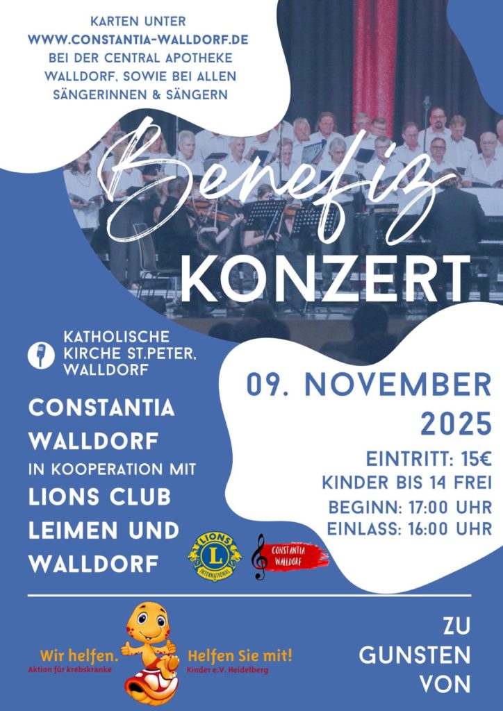 Karten können ab dem 16.07.2025 über das Kontaktformular unserer Homepage (https://constantia-walldorf.de/kontakt/), bei der Central Apotheke Walldorf (Hauptstraße 1, 69190 Walldorf) und bei allen Sängerinnen und Sängern erworben werden. Die Karte kostet 15€. Kinder und Jugendliche bis 14 Jahren sind frei und benötigen eine Kinderkarte.